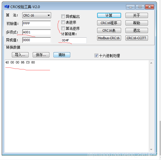 另外用CRC校验工具得到结果是相同的但是多项式却是8005,只有表中选项出上面结果,其他选线选择或不选结果是另外的。